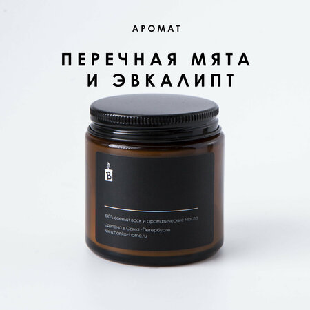Ароматическая свеча в тёмной банке из 100% натурального соевого воска "Перечная мята и эвкалипт". В нашем аромате смешаны сладкая перечная мята с темным, земляным эвкалиптом, а нотки кедрового дерева добавляют глубину в эту композицию. Все наши свечи выполнены из натурального соевого воска. Это полностью натуральный продукт. Соевый воск полностью безопасен, не вызывает аллергии, безопасен для детей и беременных женщин. Наши свечи изготовлены вручную в г. Санкт-Петербург. Они имеют минималистичный дизайн и станут прекрасным дополнением Вашего декора или отличным подарком. Время горения 20 часов. Объем банки 120 мл.