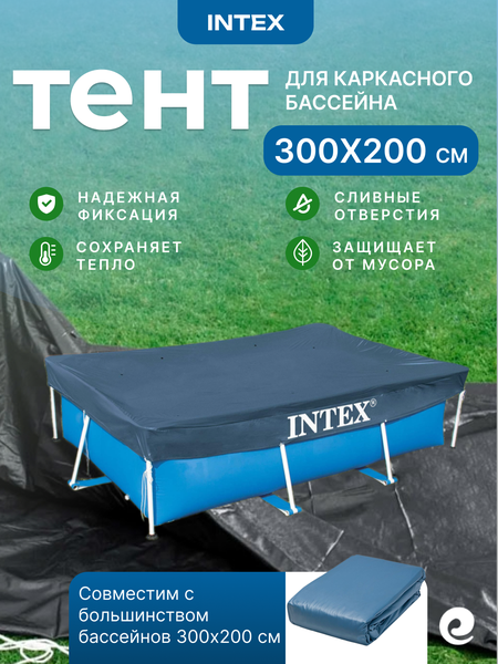 Предназначение: Для каркасного . Подходящие модели: Intex Rectangular Frame . Форма: Прямоугольник . Высота: 20 см. Длина: 300 см. Ширина: 200 см. Длина бассейна: 300 см. Ширина бассейна: 200 см. Цвет: Синий темный . Материал: ПВХ . Вес: 2.15 кг. Размер: 300х201 см Выступ: 20 см Изготовлен из прочного материала, надевается сверху, затягивается с помощью шнура, который пропущен по нижнему краю тента Описание: Тент для бассейнов Intex 28038, который убирает возможность нахождения в воде инородных предметов и разнообразного мусора. Выполнен из прочного ПВХ, защищенного от УФ-лучей. Способствует серьезному уменьшению испарения из бассейна воды. Защитный тент Intex 28038 - это лучшая покупка позволяющая сохранять тепло и предотвратить попадание мусора.