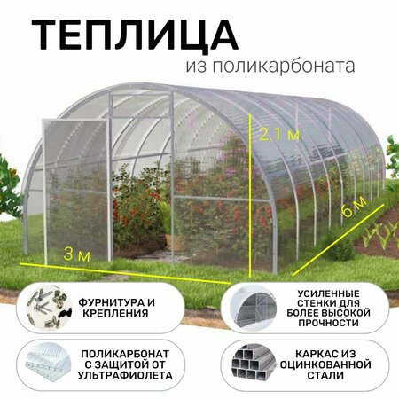 Арочная теплица из оцинкованной замкнутой трубы 20*20мм, слой цинкования будет защищать металлический каркас от появления ржавчины, что значительно продлевает срок службы теплицы в целом. В комплект входит все необходимое для установки теплицы: Поликарбонат толщиной 4мм, который разработан специально для теплиц с дополнительной защитой от ультрафиолета; 2 двери; 2 форточки, встроенные в двери; Комплект саморезов; Шпингалеты для дверей и форточек. Размер теплицы: Длина = 6м, ширина = 3м, высота = 2,1м, шаг между дугами = 1м.
