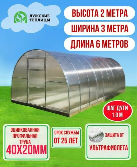 Шаг дуги 1 м. В комплект входит поликарбонат 4 мм с защитой от ультрафиолета. Каркас из цельной стальной замкнутой профильной трубы 40х20 мм Каркас оцинкован внутри и снаружи, что защищает от коррозии и ржавчины. В комплекте вся необходимая фурнитура для сборки теплицы и паспорт инструкция с пошаговым действием. Теплица поставляется напрямую с завода изготовителя, благодаря чему имеет демократичную цену и приезжает прямо на участок без повреждений от курьерских служб. При изготовлении используются исключительно проверенные и качественные материалы российского производства. Поликарбонат имеет отличную светопроницаемость и защиту от ультрафиолета UV-400, при этом он устойчив к порывам ветра и прочен. Каркас выдерживает большие нагрузки (в том числе снеговые), и не подвержен коррозии. Теплица от Завода Лужских теплиц прослужит Вам долгие годы, будет радовать отличным урожаем и требовать минимум ухода. Все наши теплицы разработаны с учетом территориального северо-западного климата и переменчивых погодных условий.