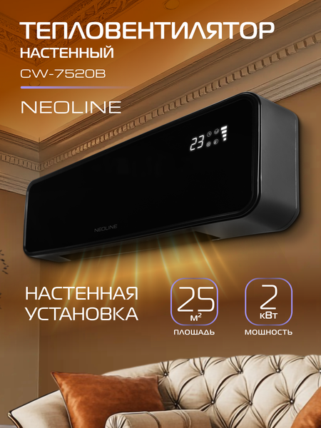 Тепловентилятор NEOLINE NFH/CW-7520W имеет максимальную функциональность и широкие возможности для применения: от жилых помещений до ресторанов, гостиниц, банков и торговых павильонов. Модель NFH/CW-7520W настенных тепловентиляторов Neoline - это эффективный и простой в установке прибор. В рекордно быстрые сроки обогревает комнату, а функция таймера позволит автоматически отключать прибор в удобный интервал времени. Прибор имеет пульт дистанционного управления в комплекте и индикацию работы. Тепловентилятор обладает преимуществом функцией «AUTO SWING» - позволяет равномерно распределить поток теплового воздуха зимой или наполнит комнату прохладой знойным летом. Настенная установка дает возможность более рационально использовать пространство в помещении.