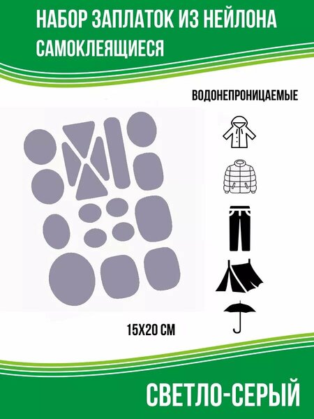 Заплатки нейлоновые для одежды. Набор нейлоновых заплаток для одежды на клеевой основе станет лучшим решением в эффективном и быстром ремонте аксессуаров, одежды. Дорогие походы в ателье и трата времени на рукодельные работы с одеждой с этого момента отменяются! Представленный набор термоаппликаций поможет обеспечить вас всем, что нужно для домашнего ремонта вещей, изделий из кожи, мебели и иных элементов. В ремкомплекте для одежды из нейлона самоклеящегося присутствуют термоклеющиеся заплатки в количестве 16 штук. Их можно наносить буквально на любой тип ткани, а также кожу и ПВХ. Латки сделаны из особого термоклеящегося материала, что обеспечивает прочность и надежность крепления изделий на поверхности. Эти патчи выдерживают большой число стирок, а также продолжительную носку, не теряя своего внешнего вида и свойств. В комплекте присутствуют различные формы изделий – треугольники, овалы, длинные полосы с закругленными концами. Потому у пользователя есть возможность производить ремонт не только прорех, но также и пятен, а также просто украсить свою одежду новыми элементами. С помощью этих самоклеящихся заплаток для куртки, плаща, палатки, рюкзака вы можете произвести ремонт поверхности буквально в считанные минуты. Этот же набор подойдет и для ремонта детской одежды, ведь в его составе гипоаллергенные и абсолютно безопасные для нежного организма материалы. Страна производитель данного продукта – Китай, но несмотря на это качество изделий всегда остается на высоте. И это легко отследить по отзывам покупателей – абсолютное большинство клиентов остались продуктом довольны. В наборе 16 заплаток на одежду самоклеящихся, водонепроницаемых, что позволяет не откладывать ремонт вещей в долгий ящик. При этом ремонту подлежат даже зонты и палатки, так как они не пропускают влагу. Не редко применяются заплатки на болоньевую одежду. Все, что нужно – приложить к месту ремонта изделие и прогладить его. Размер 150х200 мм.