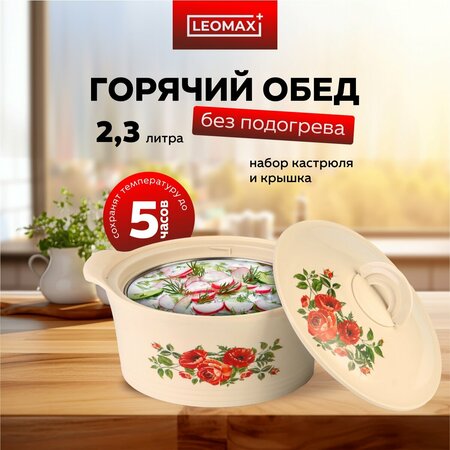 Внимание! В кастрюле Нельзя готовить. Она используется в качестве термоса для готовых блюд. Термокастрюля не предназначена для использования на всех видах плит и в духовом шкафу. Нельзя использовать в свч. Термокастрюля Магия вкуса от Леомакс - идеальное решение для всех любителей вкусной и полезной домашней еды. Термокастрюля с крышкой сохраняет еду горячей или холодной в течение 5ч благодаря системе двойной теплоизоляции и прочной крышке. Кастрюля термос для еды обеспечивает оптимальные условия для длительного сохранения температуры. Ее можно использовать как термокастрюлю для шашлыка на даче или на пикнике. Мясо останется горячим и сочным на протяжении долгого времени. В нашей коллекции представлены кастрюли объемом 2,3 л, 1,4 л, 0,7 л и 0,4 л. Внутри находится несъемная чаша из нержавеющей стали, обеспечивающая безопасное и гигиеничное хранение продуктов. Для более длительного сохранения тепла в кастрюлю необходимо сначала налить горячую воду, вылить ее, а затем положить готовое блюдо. Так вы сохраните тепло гораздо дольше. Между стенками кастрюли полиуретановый слой, который обеспечивает дополнительную изоляцию и сохраняет тепло или холод. Одно из основных преимуществ этой кастрюли для хранения еды - закручивающаяся крышка, которая надежно фиксируется, исключая возможность протекания содержимого. Это особенно важно, когда вы берете еду с собой на пикник или в поездку. Также подойдет для охлажденных продуктов. Такая кастрюля станет отличным сюрпризом для домовладельцев и любителей активного отдыха, полезный подарок маме, бабушке, жене. Термокастрюля внутри изготовлена из высококачественной нержавеющей стали, что обеспечивает прочность и долговечность товара. Она легкая и удобная в использовании, что делает ее идеальным выбором для пикника, туризма или просто для уютного отдыха на даче. Можно мыть в посудомоечной машине в щадящем режиме. Пленка с внутренней стороны крышек - транспортировочная, ее при использовании необходимо снять. Отличный подарок на 8 марта хозяюшкам!