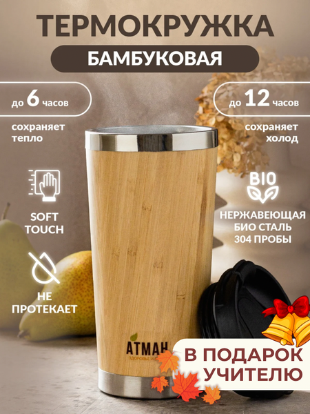 Хотите наслаждаться любимыми согревающими напитками по дороге на работу, в офисе, на прогулках, в машине или командировке? Представляем стильную и экологичную термокружку от бренда атман. Термокружка для кофе от атман имеет легкий вес, эстетична, удобна в руке, облицована деревом бамбук, внутренний стакан (колба) выполнен из пищевой стали 304 пробы, что позволяет продлить удовольствия от питья теплого напитка. Дно с внешней стороны не скользит и не царапает, т. к. имеет нескользящее покрытие. Легкая накидная защелка плотно и герметично закрывает отверстие, из которого удобно пить, т. к. ничего не проливается. В термокружке очень хорошо брать с собой любимые напитки, а также заваривать наши авторские напитки от атман. Найти их можно в нашем каталоге или в поиске по слову "суперфуды атман" Наш термостакан - уместный подарок папе или мужу, чтобы теплый напиток согревал их даже в самые сильные холода. Это отличный подарок для мамы, бабушки, девушки и сестры и полезный подарок для парня, папы или брата. Это отличный подарочный набор для учителя на 1 сентября или подарок для воспитателя - педагог сможет радовать себя любимыми напитками по дороге на работу или в школе, саду. Также можно вручить, как подарок сыну на день рождения или подарок на День знаний дочке, если они студенты. С ним пары и уроки будут проходить приятнее и полезнее, а тетрадки в рюкзаке не пострадают, ведь термостакан закрывается надежно! Термокружка будет сопровождать долгие прогулки и согревать - напитком и вашей заботой!