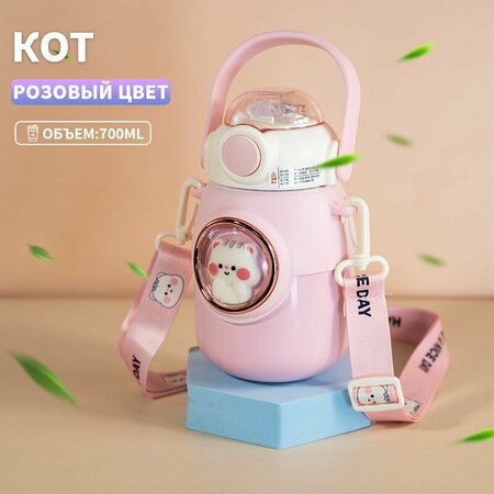 Термокружка с трубочкой и ремешком, термос для ребенка "Котик" розовый, 700 мл