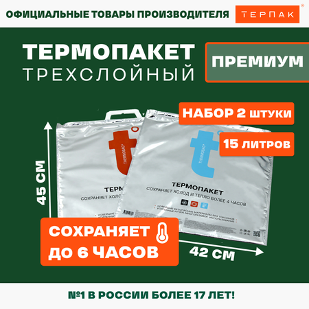 Трехслойный термопакет ТерПак Премиум t° 42х45 см. предназначен для доставки и сохранения замороженных, охлажденных и горячих продуктов. Плотно закрывающийся термопакет сохраняет тепло и холод до 6-ти часов. Удобная пластиковая ручка пакета с усиленной клипсой-защелкой не пружинит и не тянется и, главное, не расстегнется. Это препятствует легкому попаданию воздуха внутрь пакета – продукт сохраняет свою температуру значительно дольше. Пакет может применяться неоднократно, его легко мыть и использовать. Срок годности не ограничен. Изотермические свойства термопакета для замороженных продуктов улучшаются с применением аккумуляторов холода. В комплекте 2 термопакета. Производство – Россия.