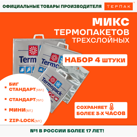 Трехслойный термопакет предназначен для доставки и сохранения замороженных, охлажденных и горячих продуктов. Плотно закрывающийся термопакет сохраняет тепло и холод более 3-х часов. Удобная пластиковая ручка пакета с усиленной клипсой-защелкой не пружинит и не тянется и, главное, не расстегнется. Это препятствует легкому попаданию воздуха внутрь пакета – продукт сохраняет свою температуру значительно дольше. Пакет может применяться неоднократно, его легко мыть и использовать. Срок годности не ограничен. Изотермические свойства термопакета улучшаются с применением аккумуляторов холода. В комплекте - 1 пакет Биг 33 л, 60*55 см; 1 пакет Стандарт 15 л, 42*45 см; 1 пакет Мини 6 л, 32*35 см; 1 пакет Zip-Lock 6 л, 25*40 см.
