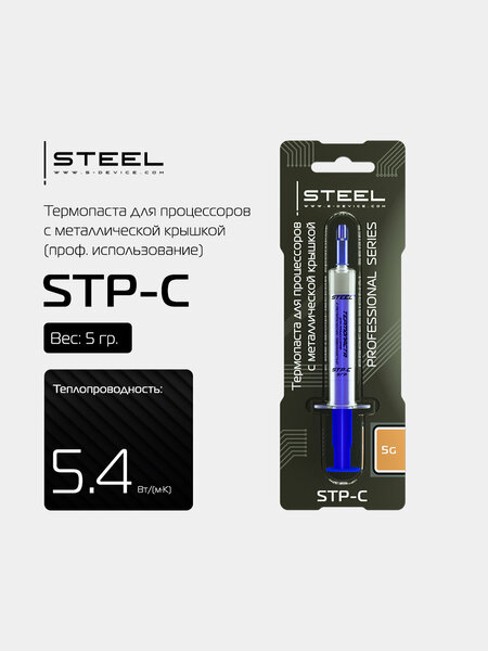 Термопаста ! STEEL STP-C, для процессоров с металлической крышкой(проф. использование) (5гр.)STP-C - термопаста создана на без силиконовой основе с использованием твердых наночастиц обеспечивающих высокую адгезию между теплораспределительной крышкой процессора и радиатором, благодаря чему показывает наилучшую теплопроводность и длительный срок эксплуатации. Технические характеристики: - Вязкость при 20°С - 70-75 Па∗с - Теплопроводность - 4.8-5.4 Вт/(м∗К) Комплектация: Шприц с термопастой.