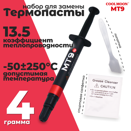 Термопаста Coolmoon MT9 обладает уровнем эффективности, который достаточен для обеспечения качества отвода тепла с поверхности корпусов процессоров, установленных в мощных игровых компьютерах. Теплопроводность аксессуара составляет 13.5 Вт/(м·К). Это очень значительный показатель. Даже в значительной степени разогнанный процессор (при наличии кулера соответствующего уровня) будет функционировать в нужном температурном режиме. Термопаста Coolmoon MT9 поставляется в шприце. Такой тип фасовки обеспечивает удобство нанесения пасты. Масса термопасты – 4 г. Рабочая температура изделия варьируется в пределах от -50 до 250 °C. Упаковка аксессуара имеет привлекательный вид. На упаковке размещена полная сопутствующая информация, в том числе – данные о свойствах и преимуществах термопасты.