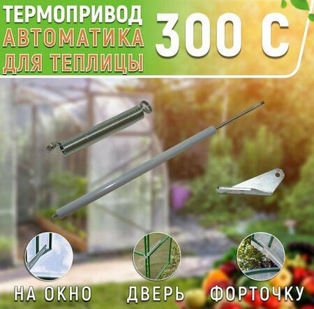 Автоматика для проветривания теплицы "Термопривод 300С", предназначена для проветривания и поддерживания оптимальной температуры в теплице, без участия человека. Что создаёт благоприятный климат и улучшение качества будущего урожая. Полное открытие створки при температуре + 26 °C обеспечивает эффективное проветривание. Полное закрытие створки при +20 °C сохраняет тепло в теплице. Регулировка и настройка не требуется. Дверь/окно, с установленным термоприводом, можно открывать при любой температуре, даже в мороз. Температура эксплуатации и хранения: -50 . + 80 °C (не требуется снятие на зиму). Каждый гидроцилиндр испытан нагрузкой в 300 кг. Рабочий ресурс не менее 10 000 циклов "открыто-закрыто". В Комплекте есть всё необходимое для установки на любую створку. Качественное уплотнение делает тугим ход штока, препятствует раскачиванию створки ветром, обеспечивает мощность изделия и длительный срок службы. При охлаждении гидроцилиндра шток не втягивается, для его утапливания требуется внешнее усилие 0,2 - 5 кг, которое создаётся пружиной. Корпус светлого цвета не нагревается солнцем, точно поддерживает заданную температуру в теплице. Хромированный шток не ржавеет. Качественные комплектующие позволяют термопривод оставлять на зиму в теплице. важно! Гидроцилиндр, воспринимающий большие ветровые нагрузки, должен крепиться как можно ближе к элементам теплицы. Пружина, создающая нагрузку 1 -5 кг, устанавливается на концы болтов. Ежегодно протирать и смазывать шток литолом, солидолом.