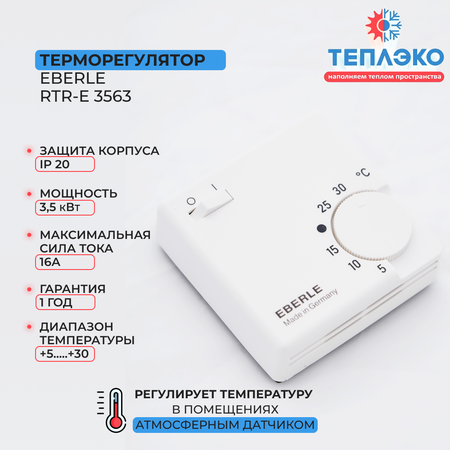 Терморегулятор представляет собой электромеханический комнатный термостат, работающий от сети 220В. Он выполняет функцию автоматического регулирования температуры для автоматических систем отопления в жилых помещениях и зданиях. Комнатный терморегулятор EBERLE RTR-E 3563 (со встроенным выключателем) — устройство, являющееся одним из компонентов автоматической системы отопления. Крепится терморегулятор как правило на стене на высоте 150 см от пола. При работе обогревателя ТеплЭко чувствительный элемент терморегулятора обеспечивает точное соответствие температуры воздуха заданной. При этом монолитный кварцевый обогреватель работает в максимально экономном режиме. Простота в использовании обеспечена техническими особенностями конструкции прибора: круговая температурная шкала с маркировкой и большие монтажные зажимы для подключения. К одному терморегулятору может быть подключено до 8 монолитных кварцевых обогревателей. Для еще более экономичной работы автоматической системы отопления мы рекомендуем установку терморегулятора с воздушным датчиком — как только в помещении устанавливается необходимая температура, прибор автоматически отключает обогреватели от электропитания, и также автоматически включает обогреватели, когда температура в помещении становится ниже заданной. Автоматический режим функционирования, который осуществляется за счёт терморегулятора с воздушным датчиком, обеспечивает системе высокую экономичность и эффективность, поскольку продолжительность работы оставляет 3-12 часов в сутки, в зависимости от утепления помещения и от температуры воздуха на улице. Обогреватели могут работать без перерыва на протяжении всего отопительного сезона, а использование в комплекте с терморегулятором позволяет оставлять прибор включенным, даже уходя из дома. Особенно нужно отметить незаменимость обогревателей с терморегулятором в загородных домах и на дачах, если вы посещаете их периодически — в выходные и праздничные дни. Перед отъездом из дома или дачи в холодное время года вам нужно всего лишь выставить температуру воздуха на терморегуляторе, например, +10°С. В данном случае система отопления прогреет воздух в помещении до +10°С и не допустит появления излишней влажности и промерзания дома, а также разрушения внутренней отделки и отклеивания обоев.