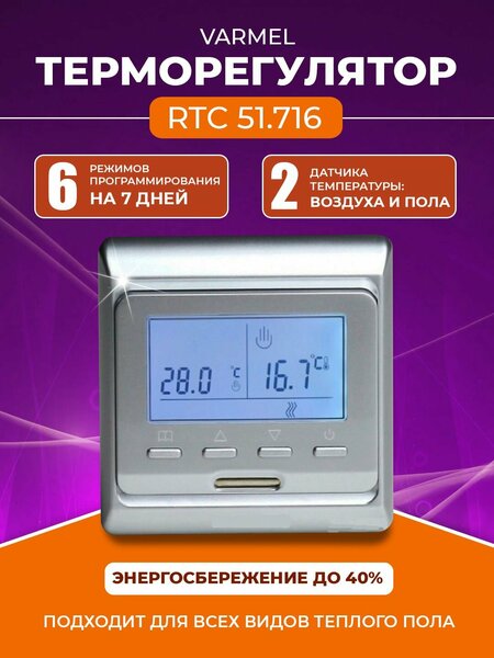 Терморегулятор Varmel RTC 51.716, выносной датчик температуры теплого пола, два винта для крепления, инструкция по эксплуатации, коробка
