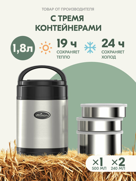 Термос для еды с тремя контейнерами, широкая горловина, Биосталь/Biostal 1.8 литра