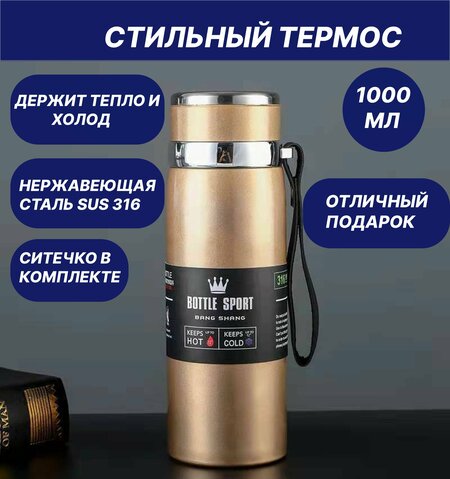 Стальной термос из нержавеющей стали 1 литр, всегда пригодится в путешествии, на учебе, на прогулке или на тренировке. Туристическая посуда изготовлена из нержавеющей стали, которая не впитывает запахи. Походный термос подойдет для еды и напитков: чай, кофе, ягодный морс, компот, которые всегда будут под рукой. Посуда для кухни долговечна и устойчива к ударам. Внутри фляги размещено сито, предотвращающее попадание заварки и посторонних предметов в жидкость. Универсальная термокружка для чая экономит место в рюкзаке или сумке. Спортивный пищевой термос кружка сохранит температуру 24 часа, а герметичная крышка не подтекает. Диаметр термокружки подходит для большинства автомобильных подстаканников, поэтому термос можно использовать как автомобильный аксессуар - автокружку, размещаемую в подстаканнике. Стальной термос для горячих напитков - это интересный подарок папе, спортсмену, охотнику, рыбаку, любимому, мужу, брату, дедушке на день рождения, юбилей, праздник или просто так! Термопосуда для похода не рекомендуется для мытья в посудомоечной машине.