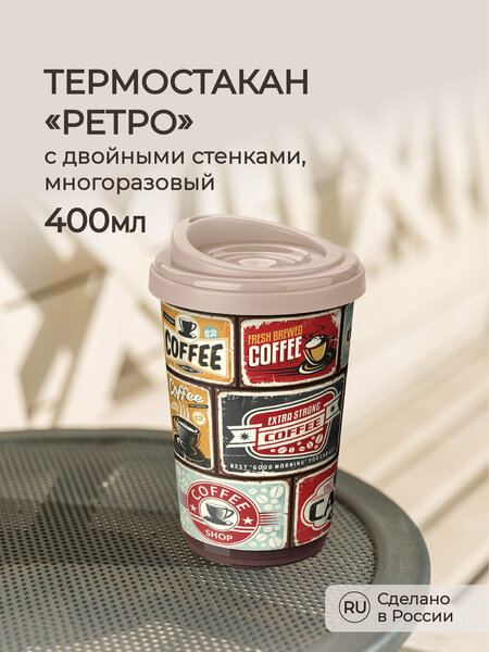 Двухслойный термостакан Phibo объёмом 400 мл идеален как для активного образа жизни, так и для созерцательного наслаждения чаем или кофе. Воздушная прослойка между стенками стакана сохраняет температуру напитка, а также не позволяет внешней стенке стакана сильно нагреваться. Крышка с эргономичным носиком плотно закручивается на корпусе, и не протекает. Стильный декор вплавлен в корпус стакана и не сотрётся с течением времени. Термостакан идеально подойдёт в качестве экологичной замены одноразовым неразлагаемым стаканчикам для кофе. Термостакан изготавливается из безопасного полипропилена, и не содержит бисфенол А, фталаты, меламин и другие вредные вещества (в отличие от бамбуковых или одноразовых стаканов).