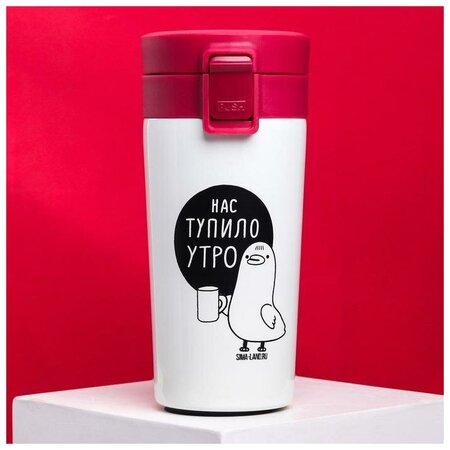 Термостакан с кнопкой «Нас тупило утро» Цвет-Белый. Время сохранения тепла/холода, ч-2. Диаметр горловины, см-5.5. Вес, г-283. Объём, мл-350. Рисунок-Да. Крышка-Да. Материал-Металл. Материал-Пластик. Сменная вставка (рисунок)-Нет.