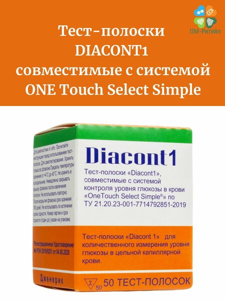 Тест-полоски «DIACONT1» предназначены для использования с глюкометрами OneTouch Select® и OneTouch Select Simple®. Тест-полоски предназначены для самоконтроля больных сахарным диабетом в домашних условиях и для медицинских работников в клинической практике для контроля концентрации глюкозы в цельной капиллярной крови. Для анализа in — vitro. Тест-полоски DIACONT1 являются аналогами оригинальных полосок OneTouch Select®. OneTouch® является зарегистрированной торговой маркой корпорации Johnson&Johnson. Они могут использоваться людьми с сахарным диабетом для самоконтроля, а также медработниками для обследования пациентов в лечебно-профилактических учреждениях с целью контроля эффективности лечения сахарного диабета. Тест-полоски «DIACONT1» предназначены для использования с глюкометрами OneTouch Select® и OneTouch Select Simple®. Тест-полоски предназначены для самоконтроля больных сахарным диабетом в домашних условиях и для медицинских работников в клинической практике для контроля концентрации глюкозы в цельной капиллярной крови. Для анализа in — vitro. Тест-полоски DIACONT1 являются аналогами оригинальных полосок OneTouch Select®. Они могут использоваться людьми с сахарным диабетом для самоконтроля, а также медработниками для обследования пациентов в лечебно-профилактических учреждениях с целью контроля эффективности лечения сахарного диабета.