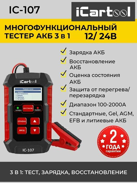 iCartool IC-107 - многофункциональный тестер для обслуживания вашего аккумулятора сочетающий в себе 3 функции. С его помощью вы можете:
