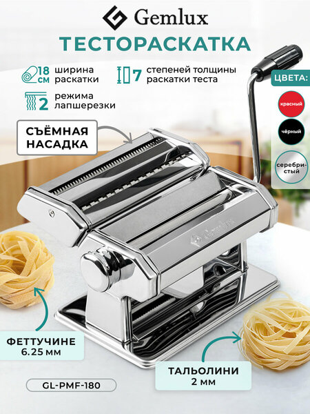 Тестораскатка лапшерезка ручная Gemlux GL-PMF-180 – незаменимый помощник хозяйки. Это металлическая кухонная утварь, приспособление для раскатки крутого теста в пласт при изготовлении пасты: лазаньи, канеллони, равиоли. Аппарат также можно использовать как раскатку теста для чебуреков, для раскатывания теста при лепке пельменей, резки домашней лапши, лапши для лагмана и других макаронных изделий. Механическая раскаточная машинка оснащена 1 парой валков, которые приводятся во вращение вручную при помощи съемной рукоятки. Ширина раскатки 18 см, толщина пласта регулируется в пределах от 0,5 до 3 мм (7 положений). Для регулировки зазора между валками оттяните ручку регулятора в сторону (не перекашивая ее!), поверните в нужном направлении и верните на место так, чтобы зубец на ручке вошел в предназначенный для него паз. В комплект тестораскатывающей машины входит съемная двусторонняя насадка лапшерезка для нарезки плоской лапши тальолини шириной 2 мм и феттучине шириной 6,25 мм. Для крепления к поверхности стола, чтобы зафиксировать тесто раскатыватель в процессе работы, предусмотрена струбцина. Машина для приготовления лапши выполнена из хромированной стали. Обратите внимание! Прибор нельзя мыть водой и в посудомоечной машине. Очищайте его от муки и остатков теста сухой щеткой. Тестораскатыватель предназначен для раскатки очень крутого теста! Лучше всего он работает с таким рецептом: на 200 г муки - 2 яйца, 1 ст. л. растительного масла и 1/2 ч. л. соли. После замеса такое тесто выглядит как смесь сухих комочков. Слепите его в шар, дайте отлежаться и нарежьте на небольшие куски. Чтобы машинка не рвала тесто, необходимо начинать с самого большого зазора между валками. Пропустите кусок между валками, присыпьте мукой, сложите пополам, поверните на 90о и снова пропустите. Повторите несколько раз. Уменьшите зазор на единицу и повторите процедуру. Постепенно тесто будет становиться более тонким, гладким и пластичным. Не забывайте присыпать мукой, чтобы лапша не слипалась.
