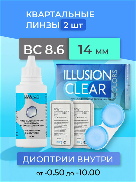 ILLUSION clear – прозрачные контактные линзы с квартальным сроком замены. В комплекте 2 линзы, раствор и контейнер. • Гидрогелевые линзы изготавливаются из гидрофильных полимеров, которые способны впитывать большое количество воды, обеспечивая влагу и комфорт для глаз. • Материал, используемый в ILLUSION Clear, более мягкий и гибкий, что обеспечивает большее комфортное ношение. • Линзы имеют выгодное соотношение цены и качества по сравнению с другими видами контактных линз. • Если у вас сухие глаза, гиперчувствительность или аллергия, то гидрогелевые линзы могут подойти лучше всего. Кривизна контактных линз 8.6 мм, а также диаметр 14 мм. являются характеристиками контактных линз, которые часто используются и считаются универсальными для большинства людей. Они обеспечивают правильное прилегание линзы к поверхности глаза, а также оптимальный размер контактной площади для комфортного использования.