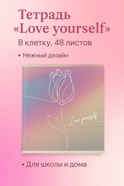 Нежная и вдохновляющая тетрадь с лаконичным дизайном цветка в одной линии и фразой «Love yourself». Мягкие пастельные оттенки создают спокойное настроение. Подходит для школьных занятий, записей и домашнего использования. Формат: A5 Количество листов: 48 Разметка: в клетку Обложка: матовая, пастельный градиент, лаковая печать Бумага: белая офсетная Производство: Россия Характеристики для Яндекс Маркета: Поле Значение Название Тетрадь «Love yourself», в клетку, 48 листов, A5, пастельная Тип товара Тетрадь Формат A5 Количество листов 48 Количество в наборе 1 шт Разметка В клетку Тип бумаги Офсетная белая Обложка Мягкая, матовая, с лаковой печатью Переплёт Скрепка Цвет от производителя Пастельный розовый, бежевый, сиреневый Производство Россия SKU TETRAD-SOFT-LOVE-YOURSELF-PASTEL-A5-48 ИКПУ TETRAD-GRADIENT-LINE-FLOWER-A5-48-LOVE