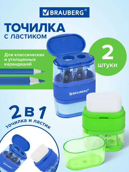 Точилка для карандашей с ластиком, набор 2 штуки, 2 отверстия, с контейнером, синяя/зеленая, Brauberg Double, 271995
