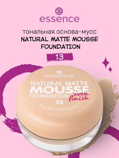 Тональная основа мусс NATURAL MATTE MOUSSE FOUNDATION – лучший выбор для естественного макияжа. Его легкая текстура обеспечивает матовое покрытие, при этом не перегружая кожу и не создавая эффект маски. В результате получается эффект мягкого фокуса и пудровое покрытие. Тональный крем обладает средней плотностью покрытия, что позволяет скрыть недостатки кожи и при этом сохранить естественный вид. Комфортная и легкая муссовая тональная основа легко наносится и равномерно распределяется по коже. Тоналка позволяет коже дышать, не забивая поры и морщинки и не ощущается на коже. Кроме того, формула не окисляется, что гарантирует стойкий и комфортный результат на весь день. Благодаря веганским ингредиентам, она подходит для всех типов кожи, включая чувствительную, а также она дерматологически протестирована. С этим тональным муссом вы сможете создать как повседневный макияж, так и более выразительный образ, подчеркнув свою красоту и ухоженность. Большое количество оттенков позволяет подобрать тональник под любой тон кожи. Это мастхэв в женской косметичке и в рабочем кейсе. Почувствуйте уверенность и комфорт с тональной основой от essence - ваш ключ к безупречному макияжу каждый день! Это замечательная идея для подарка родным и близким на Новый год, Рождество или День рождения. Этот универсальный продукт подойдет для девочек, подростков, девушек и женщин, станет их незаменимым помощником в дневном и вечернем макияже! Это прекрасный сюрприз для мамы, жены, сестры, подруги, любимой девушки или коллеги. Идея подарка, которая порадует на 8 Марта, на НГ, на ДР, День всех влюбленных или День матери, а также станет отличным выбором для милого подарочка под елкой для детей. Может послужить самостоятельным подарком или дополнением к вашему сюрпризу на юбилей, годовщину или значимую дату! Такой небольшой, но приятный презент подарит тепло, радость и внимание в любой день – будь то праздник или просто желание сделать приятное без повода!