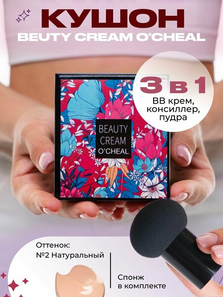 Кушон Beauty Cream O’cheal прекрасное тональное средство, которое не только маскирует недостатки кожи и выравнивает цвет лица, но и ухаживает за ней, благодаря большому количеству питательных веществ. Многофункциональнsq BB крем, который может заменить вам консилер, тональный крем и пудру. Для равномерного нанесения и экономичного расхода бб крема, в комплект входит мягкий и эластичный спонж для лица. Средство легко наносится, удобно в использовании. Подходит для всех типов кожи, увлажняет, питает и матирует кожу лица, идеально перекрывает тёмные круги под глазами, убирает покраснения на лице, пигментацию и другие несовершенства. После нанесения крема кожа становится мягкой, свежей и упругой, поверх отлично ложатся румяна и тени без прилипания. Основные действующие компоненты: Витамин Е (токоферол) устраняет отечность и следы усталости, обеспечивает питание. Фитоэкстракты оказывают регенерирующее и противовоспалительное действие. Способ применения: как тональной основы – слегка намочите спонж и нанесите крем на кожу лица притаптывающими движениями, растушёвывая. Как консилер – выполните те же действия сухим спонжем. После использования рекомендуется промыть спонж и просушить его сухой салфеткой.