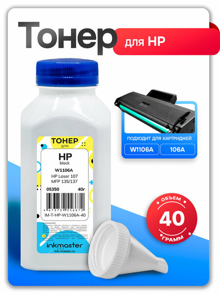 Тонер для картриджа W1106A (106A) для заправки HP Laser 103a, 107a, 107r, 107w, 107wr, 108a, 108w, 135a, 135r, 135w, 137fnw, 136wm (40г) с воронкой (без чипа)