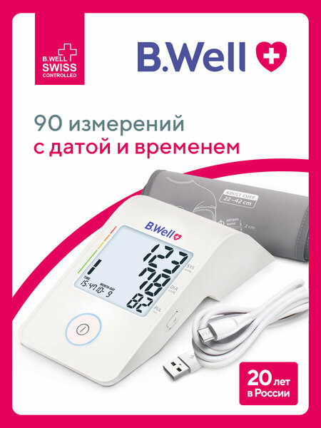 Тонометр автоматический B.Well MED-53 cord — современный, точный и надежный прибор для измерения артериального давления и частоты пульса. Тонометр оснащен технологией Intellect Active. Измерение происходит на этапе нагнетания воздуха в манжету и подстраивается под каждого пользователя индивидуально. Это позволяет измерить давление точно, быстро и комфортно. Тонометр автоматический на плечо одобрен Российским кардиологическим обществом за точность. Анатомическая манжета для тонометра B. Well обеспечивает комфортное и точное измерение. Ее универсальный размер M-L (22-42 см) подойдет для любого члена семьи и человека с любым телосложением. Манжета удобна при надевании, так как ложится по форме руки. Плотное прилегание к руке помогает достичь более точного результата во время измерения. Съемный чехол манжеты можно постирать в стиральной машине. Тонометр для давления оснащен контролем правильной фиксации манжеты. Специальный значок на дисплее сигнализирует о том, что манжета надета правильно. Если она надета туго или свободно, автоматический тонометр выдаст соответствующий сигнал об ошибке на дисплее. Тонометр MED-53 c USB-кабелем имеет подсветку экрана и широкий угол обзора до 90°. Цветная шкала помогает определить уровень своего давления по классификации Европейского общества гипертонии. Прибор для измерения давления сохраняет в памяти 90 результатов с датой и временем, что позволяет вести полноценный дневник АД. Тонометр для измерения давления MED-53 работает от обычного кабеля Micro-USB или от 4 стандартных батареек ААА. Кабель можно подключить к любому адаптеру, ноутбуку или powerbank. Длина кабеля составляет 1,5 м. Аппарат для измерения давления легко можно взять с собой в дорогу, а практичная сумка в комплекте защитит прибор от повреждений во время транспортировки.