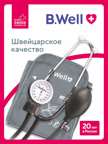 Механический тонометр медицинский со встроенным стетоскопом B.Well MED-63. Для измерения давления методом Короткова. Швейцарская разработка. Тонометр механический имеет Регистрационное удостоверение. Предоставлена гарантия на 5 лет и 10 лет бесплатного сервисного обслуживания. Тонометр механический со стетоскопом рекомендован для семейного домашнего использования, а также для измерения давления медработниками в клиниках. Улучшенный тонометр механический для измерения давления гарантирует высокую точность измерений, не реагирует на электромагнитные волны. Значения на шкале легко считывать. Металлический корпус манометра обеспечивает надежность прибора. Для самостоятельной калибровки в наборе есть специальный ключ. Тонометр оснащен встроенным стетоскопом, что облегчает домашнее измерение давления. Хромированные ушные трубки надежны и прочны. Мягкие эргономичные оливы создают комфорт использования и хорошую акустику. Манжета тонометра из плотного нейлона имеет универсальный размер 22–42 см и удлиненную велкро-застежку. Она подходит пользователям с любой полнотой руки. Края округлые с окантовкой. Для самостоятельной фиксации предусмотрено наличие металлического кольца. Пневмокамера манжеты создана из прочного латекса по бесшовной технологии. Это продлевает срок эксплуатации прибора на годы. Нагнетатель выполнен из упругого латекса, который сохраняет свойства длительный срок. Пылезащитный фильтр предотвращает внутреннее загрязнение тонометра и поддерживает точность измерений. Игольчатый клапан обеспечивает плавное стравливание воздуха с необходимой скоростью. Благодаря этому процедура измерения комфортна. Механический тонометр компактный. Для хранения в наборе есть сумка-чехол. Ее размер увеличен, поэтому тонометр удобно вынимать и складывать обратно.