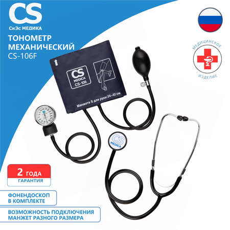 CS Healthcare CS-106 - механический тонометр для самостоятельного измерения артериального давления. Он обладает отличным качеством, высокой точностью измерения и придется по вкусу любителям классического метода измерения. Прибор прост в использовании и соответствует всем требованиям безопасности. Преимущества: Металлический манометр анероидного типа с легкочитаемой шкалой. Мягкая эластичная груша, позволяющая нагнетать воздух в манжету без особых усилий. Она оснащена пылезащитным фильтром и хромированным спускным вентилем. Универсальная нейлоновая манжета (без фиксирующего кольца), предназначенная для руки окружностью 24-42 см. Возможность подключения 5 видов манжет различного размера (на окружность плеча от 9 до 50 см). Наличие сумки для хранения прибора. Одобрено Росздравнадзором - имеется Регистрационное Удостоверение (РУ). На данное изделие имеется Регистрационное Удостоверение. Это означает, что продажи прибора на территории РФ одобрены Росздравнадзором, и прибор занесен в Государственный реестр. Росздравнадзор подтверждает, что данное изделие относится к категории медицинской техники, что все заявленные производителем характеристики верны, и прибор абсолютно безопасен при правильном использовании. Тонометр CS-106 - один из лучших представителей бюджетных тонометров.