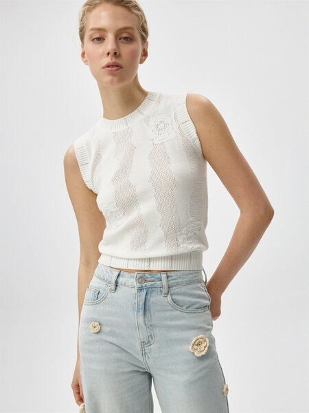 Женский вязаный летний топ с цветочным узором бренда SELA - воздушная модель для создания романтичных образов. Топ выполнен в технике опенворк с ажурным цветочным рисунком, который придает образу особую легкость и женственность. Полуприлегающий крой свободно облегает фигуру, подчеркивая изящество силуэта. Круглый вырез горловины, проймы и подол оформлены оригинальным рубчиком с волнистым краем, добавляя модели игривое настроение. Легкая дышащая пряжа обеспечивает комфорт даже в жаркую погоду, а ажурная вязка создает эффект воздушности. Этот топ идеально сочетается с юбками-миди, шортами и легкими брюками, подходя как для прогулок, так и для свиданий. Универсальная бежевая или пастельная гамма делает модель базовой вещью летнего гардероба. Особенность - нежная работа вязки, придающая изделию эксклюзивность. Топ легко комбинируется с джинсовыми куртками, кардиганами или шелковыми шарфами для создания многослойных образов. Уход за изделием прост - сохраняет форму после стирки. Изысканный вязаный топ с цветочным узором станет любимой вещью в вашем гардеробе, подчеркивая нежный вкус и чувство стиля.