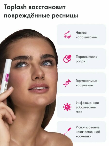 Сыворотка для роста ресниц и бровей Toplash Lash & Brow Booster 3 мл Эффективное средство для активного роста, укрепления и восстановления ресниц и бровей. Специально подобранные пептиды, растительные экстракты и витамины активируют естественные процессы роста, придавая волоскам заметную длину, густоту и прочность. Формула подходит даже для чувствительных глаз — без гормонов, масел и отдушек. ⠀ Результат, подтверждённый тестами Клинические исследования показали: ◉ Длина ресниц увеличивается на 52,3 % ◉ Объём — на 31,9 % ◉ Прочность — на 30,6 % ◉ 98 % пользователей заметили эффект уже через 21 день ◉ Максимальные результаты достигаются через 8 недель регулярного применения ⠀ Как работает сыворотка Эффективность средства основана на синергии активных компонентов: ◉ Увлажняющие агенты (глицерин, пантенол, пропандиол) сохраняют оптимальный водный баланс кожи и волосков ◉ Пептиды (Biotinoyl Tripeptide‑1 и Myristoyl Pentapeptide‑17) стимулируют рост и укрепляют корни ресниц и бровей ◉ Натуральные растительные экстракты (азиатская центелла, корень женьшеня, чай, солодка, розмарин, ромашка и др.) смягчают кожу, уменьшают раздражение и создают благоприятную среду для роста ◉ Гелеобразующий компонент (ксантановая камедь) придаёт сыворотке комфортную текстуру и облегчает нанесение ⠀ Как применять Нанесите сыворотку тонкой кисточкой на сухую, чистую кожу по линии роста верхних ресниц и/или на брови. Используйте один раз в день, предпочтительно вечером. Избегайте попадания в глаза. Для выраженного эффекта: ◉ Применяйте ежедневно в течение 8 недель ◉ Затем — 2–3 раза в неделю для поддержания результата ⠀ Условия хранения ◉ Храните при комнатной температуре ◉ Берегите от солнечного света и влаги ◉ Срок годности — 24 месяца ◉ После открытия используйте в течение 6 месяцев
