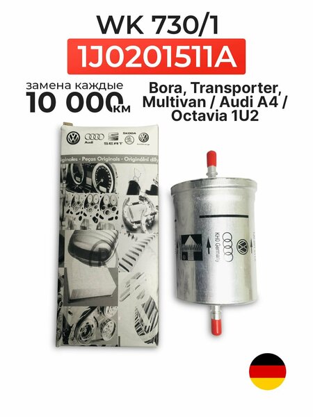 Топливный фильтр VAG 1J0201511A предназначен для тонкой очистки бензина / дизельного топлива от примесей, микро частиц. Хороший топливный фильтр снижает вероятность поломки топливной системы и уменьшает износ агрегатов, связанных сжиганием топлива. Данный топливный фильтр состоит из герметичного металлического корпуса, внутри которого находится фильтрующий элемент. Применимость: Volkswagen: Bora седан (1J2), Bora универсал (1J6), GOLF VAN IV Variant (1J5), (1J5), Golf Variant IV (1J5), Golf хэтчбек IV (1J1, 9B1), Multivan V (7HM,7HF,7EF,7EM,7EN,7HN), New Beetle кабрио (1Y7), New Beetle хэтчбек (9C1, 1C1), Transporter c бортовой платформой V (7FZ,7JZ,7FL,7FE,7JL,7JE,7FD,7JD), Transporter автобус /California, Caravelle V (7HB,7HC,7HJ,7EB,7EC,7EF,7EG,7EJ), Transporter фургон V (7HA,7HH,7EA,7EH) Audi: A3 хэтчбек (8L1), A4 Avant II (8E5, B6), A4 Avant III (8ED, B7), A4 кабрио II (8H7, B6), A4 кабрио III (8HE, B7), A4 седан II (8E2, B6), A4 седан III (8EC, B7), A8 II (4E2, 4E8), TT Roadster кабрио (8N9), TT купе (8N3) Seat: Exeo ST универсал (3R5), Exeo седан (3R2), Leon хэтчбек (1M1), Toledo седан II (1M2) Skoda: Octavia лифтбек (1U2), Octavia универсал (1U5) Bentley: Continental Flying Spur (3W2), Continental GT кабрио II (3W4,3W7,394), Continental GT купе II (3W3,3W8,393)