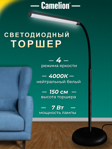 Торшер светильник напольный Camelion KD795 C02 черный представляет собой стильное и функциональное решение для освещения вашего дома или офиса. Светильник напольный оснащен встроенным светодиодным источником света, который обеспечивает яркость в 450 лм и цветовую температуру 4000 K, что создает нейтральный, естественный тип свечения. Мощность светильника составляет 6 Вт, что делает его энергоэффективным и экономичным. Торшер светодиодный имеет 4 уровня яркости, что позволяет регулировать интенсивность света в зависимости от ваших потребностей и предпочтений. Сенсорное управление на торце плафона обеспечивает удобство и простоту использования. Устойчивое тяжелое основание и длина провода питания более 1,6 м гарантируют стабильность и надежность светильника. Материал корпуса светильника светодиодного – металл и пластик, что обеспечивает прочность и долговечность изделия. Степень пылевлагозащиты IP20 обеспечивает защиту от пыли, а класс электробезопасности III гарантирует безопасность использования. Торшер напольный Camelion KD795 C02 черный выполнен в минималистичном стиле и представлен в черном цвете, что позволяет ему гармонично вписаться в любой интерьер. Выбирая торшер светильник напольный Camelion KD795 C02 черный, вы получаете стильное, функциональное и энергоэффективное решение для освещения вашего дома или офиса.