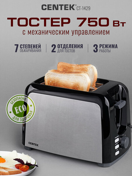Тостер Centek CT-1429 - это сочетание функциональности и стильного дизайна. Корпус прибора выполнен из металла и пластика в элегантном черном и серебристом цвете, что придает ему современный и стильный вид. Мощность тостера составляет 750 Вт, что обеспечивает быстрое и равномерное обжаривание тостов. В тостере предусмотрено 2 отделения для одновременного приготовления двух тостов. Одной из особенностей тостера является наличие 7 уровней прожарки, что позволяет выбрать степень обжарки по своему вкусу. Функция подогрева позволяет быстро разогреть уже приготовленные тосты, а функция размораживания поможет разморозить хлеб перед приготовлением. Тостер оснащен механическим управлением с поворотным переключателем и LED-подсветкой, что обеспечивает простоту и удобство использования. Кнопка отмены приготовления позволяет прервать процесс приготовления в любой момент. Съемный поддон для крошек легко снимается и очищается, что делает процесс уборки после использования тостера максимально простым и быстрым. Тостер Centek CT-1429 - это надежный и функциональный помощник на вашей кухне, который станет незаменимым атрибутом для приготовления вкусных и ароматных тостов.