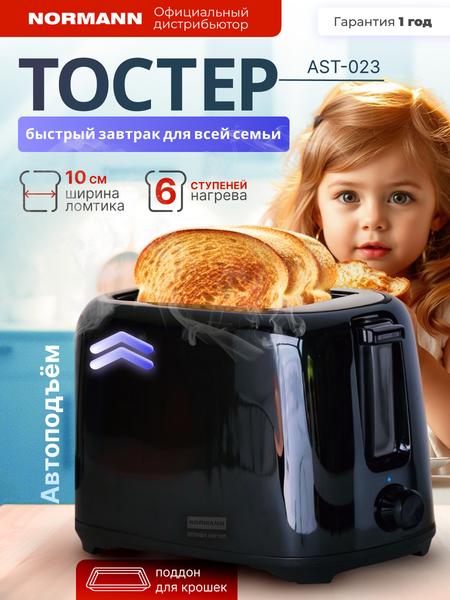 Тостер для хлеба с поддоном для крошек черный NORMANN (AST-023) линейка компактных тостеров Allman serien на 2 ломтика хлеба незаменимый помощник на кухне каждого дома, электрическая мощность устройства 700 Вт. Тостер оборудован 2 слотами - отделениями для тостов и решеткой, которая безопасно удерживает хлебные изделия, максимальная ширина ломтика хлеба 100 мм. Благодаря регулировки степени двустороннего поджаривания и центрированию вы получите равномерно приготовленные тосты, а функция досрочной отмены поможет достать хлебушек если хотите это сделать раньше таймера. Кухонный девайс для приготовления вкусных бутербродов с выдвижным металлическим поддоном для крошек, имеет мини габариты его можно хранить даже на небольшой кухне или даче. Стильный дизайн позволит эстетично хранить технику на видном месте и оптимизировать рабочее пространство на кухне. Тостерница для хлеба имеет корпус из пищевого пластика, в трендовом черном цвете с классическим дизайном, который отлично впишется в любое кухонное пространство. Бытовая техника для кухни имеет функцию автоматического подъема тостов, что предотвращает касание нагретых частей из нержавеющей стали. Тостер для поджаривания хлеба подходит для различных видов выпечки, таких как булочки, сэндвичи и хлеб из пшеничной и ржаной муки, подходит для приготовления сухариков в любое блюдо. Добавьте это полезный и удобный гаджет на вашу кухню и наслаждайтесь ароматным завтраком каждое утро! Качество, функционал и польза делают этот девайс отличным подарком для любителей кулинарных экспериментов. Товар упакован в яркую и плотную коробку. Отличный подарок на 8 марта, новый год, день рождения или новоселье для любимой мамы, подруги, бабушки или дочери.