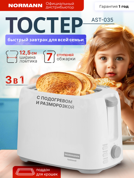 Тостер для хлеба с поддоном для крошек AST-035 NORMANN (AST-035) бытовая техника для кухни от бренда NORMANN незаменимый помощник на кухне каждого дома, электрическая мощность устройства 750 Вт. Благодаря функциям подогрева, разморозки и поджаривания, этот компактный прибор позволит вам наслаждаться вкусными и хрустящими тостами каждый день. Тостер оборудован 2 слотами - отделениями для тостов и решеткой, которая безопасно удерживает хлебные изделия, максимальная ширина ломтика хлеба 125 мм. Функция разморозки позволяет готовить тосты из замороженного хлеба, а функция подогрева – поможет сохранить тепло уже готовых изделий. Благодаря регулировки степени двустороннего поджаривания и центрированию вы получите равномерно приготовленные тосты, а функция досрочной отмены поможет достать хлебушек если хотите это сделать раньше таймера. Девайс для приготовления вкусных бутербродов с выдвижным металлическим поддоном для крошек, имеет мини габариты его можно хранить даже на небольшой кухне или даче. В нижней части прибора имеется органайзер для хранения сетевого шнура, это позволит эстетично хранить технику на видном месте и оптимизировать рабочее пространство на кухне. Тостерница для хлеба имеет корпус из пищевого пластика, в трендовом белом цвете с классическим дизайном, который отлично впишется в любое кухонное пространство. Удобные нажимные и поворотные кнопки управления, встроенная подсветка подсказывает о выбранном режиме и готовности тостов, удобно использовать даже в темное утреннее и вечернее время суток. Бытовая кухонная техника имеет функцию автоматического подъема и экстра-подъема тостов, что предотвращает случайное касание нагретых частей из нержавеющей стали. Тостер для поджаривания хлеба подходит для различных видов выпечки, таких как булочки, сэндвичи и хлеб из пшеничной и ржаной муки, отлично справится с приготовлением сухариков в любое блюдо. Добавьте это полезный и удобный гаджет на вашу кухню и наслаждайтесь ароматным завтраком каждое утро! Качество, функционал и польза делают этот кухонный девайс отличным подарком для любителей кулинарных экспериментов. Товар упакован в яркую и плотную коробку. Отличный подарок на 8 марта, новый год, день рождения или новоселье для любимой мамы, подруги, бабушки или дочери.