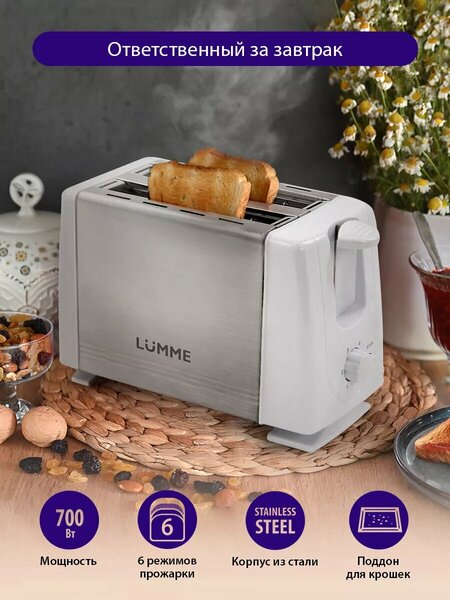 Внимание: фиксатор тостов работает только после включение тостера в сеть! Тостер электрический для хлеба, 700W, корпус сталь/пластик, 6 режимов обжаривания, 2 отделения для тостов, функция отмены, отделение для хранения шнура, лоток для крошек Тостер в корпусе из пищевой нержавеющей стали и термостойкого пластика, 6 режимами работы и плавной регулировкой мощности. 6 режимов обжаривания позволят получить хрустящие равномерно обжаренные тосты из любых сортов хлеба - от светлого пшеничного до темного ржаного. Прибор оснащен двумя отсеками для одновременного обжаривания двух кусочков хлеба, а съемный поддон для крошек существенно упрощает его очистку. Функция автоматического отключения при перегреве исключает риск его повреждения, а материал корпуса – опасность обжечься. Товары для кухни! Предназначен для дома, для офиса, для дачи. Вы всегда можете найти наш тостер для тостов электрический по скидке. Техника для кухни бытовая техника электротостер отлично на подарок на 8 марта маме, подарок на новый год бабушке, подарок на новоселье. Приготовление блюд с использованием кухонная техника марта сделает ваши рецепты вкусными и полезными! Девайсы для кухни – необычайно полезный прибор для вкусного и здорового питания. Удобный гаджет для приготовления вкусной и здоровой пищи, электроприбор для кухни для похудения.