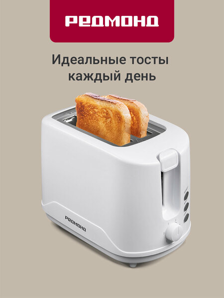 С тостером РЕДМОНД RT-437 вы быстро приготовите хрустящие тосты к завтраку для всей семьи. Хлеб обжаривается равномерно с двух сторон и без масла. Минималистичный дизайн прибора выполнен в белом цвете, что приятно освежит интерьер любой кухни. 6 уровней обжарки Достаточно повернуть механический регулятор на корпусе, чтобы получить тосты нужной прожарки: слегка румяные или с яркой золотистой корочкой. Если вы заметили, что ломтики уже поджарились – нажмите кнопку отмены и у вас ничего не подгорит. Подогрев готового тоста Завтрак уже завершен, а пара тостов осталась? Положите их в холодильник и после воспользуйтесь функцией подогрева: остывшие ломтики станут горячими, но не пересушатся. Разморозка Если хлеб не успел разморозиться, а уже пора готовить завтрак – включите режим разморозки. Тостер сам равномерно и быстро разморозит хлеб перед тем, как поджарить его. Выдвижной поддон для крошек Благодаря выдвижному поддону ухаживать за устройством очень просто. Пока хлеб поджаривается, крошки падают в специальный поддон, который легко вынуть и очистить. Так на кухне сохраняется полная чистота. Автоматический выброс За один раз можно приготовить сразу два тоста: это один сэндвич или два бутерброда. Прибор не подбрасывает готовые тосты, а плавно выдвигает – вам не придется вздрагивать от внезапного звука. Удобное хранение Компактный тостер не займет много места на вашей кухне, а длины сетевого шнура хватит, чтобы вы не искали удлинитель. Если вы затеяли перестановку, сверните провод и закрепите защелками на дне прибора. Профессионал на вашей кухне!