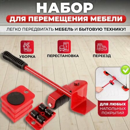Домкрат для мебели, набор для перемещения мебели, изготовленный из металла и ПВХ, предназначен для самостоятельной перестановки мебели в квартире. Вам понадобится лишь приподнять мебель с помощью рычага транспортёра для перемещения мебели и подложить под каждый угол транспортную платформу с вращающимися колесиками. После установки мебели на платформы приспособления для перемещения мебели ее можно передвигать в любом направлении. Благодаря устройству подъемника для мебели , Вы защитите мебель, пол и стены от повреждений, сэкономите время и сбережете здоровье. Домкрат подкатной словно крепкий силач для передвижения мебели подходит для плитки, паркета, ламината. Уникальная конструкция подъемного рычага мебельного домкрата и платформ из прочной закаленной стали мебельного домкрата позволяет поднимать даже тяжелую мебель со всем содержимым. В комплект транспортера для перестановки мебели входит: 4 транспортировочные платформы каждая на 8 колесиках из сверхпрочного полиамида - максимальная нагрузка на каждую платформу 150 кг; подъемный рычаг из качественной стали с прорезиненной ручкой. Транспортер мебели очень облегчит переезд или перестановку. Передвигатель мебели сэкономит время, силы и сбережет здоровье. Домашний домкрат очень прост в использовании. Набор для перемещения мебели на колесиках не требует много места для хранения. Домкрат для мебели отлично дополнит набор инструментов для дома. Система для перемещения мебели используется для перемещения мебели и крупной бытовой техники.
