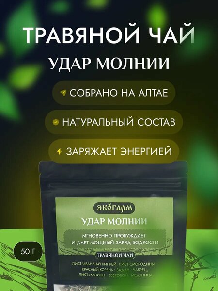 Травяной чай “Удар молнии” — это мощный напиток, который мгновенно пробуждает и дает заряд бодрости. Состав чая был тщательно подобран, чтобы быстро восстановить силы и поддержать энергию на весь день. Чай идеально подходит для тех, кто нуждается в дополнительной энергии и стремится к активному образу жизни Чай обладает ярким и насыщенным вкусом, который наполняет энергией с каждым глотком. Он включает в себя натуральные травы, которые поддержат ваш организм и помогут бороться с усталостью. Состав: - Лист иван-чая кипрея – помогает поддерживать здоровье, способствует улучшению пищеварения и бодрости - Лист смородины – поддерживает иммунную систему и способствует очищению организма - Красный корень – помогает повысить выносливость и поддерживает силы в моменты физической активности - Бадан – поддерживает здоровье суставов и улучшает циркуляцию крови - Чабрец – обладает антисептическим действием, помогает поддерживать дыхательную систему в норме - Лист малины – поддерживает здоровье кишечника и помогает укрепить иммунную систему - Зверобой – улучшает настроение, помогает справляться с депрессией и усталостью - Медуница – поддерживает нормальную работу дыхательных путей и помогает организму восстановиться Преимущества чая “Удар молнии”: - Мгновенное пробуждение: помогает быстро восстановить силы и получить мощный заряд энергии - Поддержка иммунной системы: благодаря богатому составу чай поддерживает защитные функции организма - Энергия и бодрость: идеально подходит для людей, которым нужно быстро зарядиться энергией и бодростью - Натуральный состав: чай состоит из натуральных трав, без добавок и красителей Условия хранения: Хранить в сухом месте при температуре не выше +25 °C, относительной влажности не более 70% Способ приготовления: Засыпьте 1-2 столовые ложки травяного сбора в чайник и залейте 500 мл кипятка. Дайте настояться 5-7 минут, затем процедите и наслаждайтесь вкусом Срок годности: 2 года при соблюдении условий хранения. Дата изготовления указана на отрывном слое дой-пака