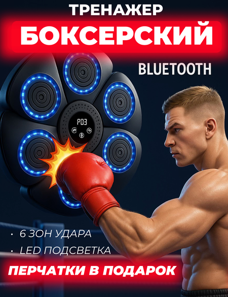 ТРЕНИРОВКА ПРЯМО У ВАС ДОМА! Представляем вам настенный тренажер для бокса – идеальный выбор как для малыша, так и для взрослого. Этот электронный тренажер способствует развитию ловкости, координации и выносливости. Настенный тренажер не займет много места в вашем доме, при этом поможет всегда находиться в форме. Выполнен из прочного abs-пластика и мягкой резины. Крепится вертикально на стену на двусторонний скотч, является заменителем привычной боксерской груши. Имеет несколько скоростей и режимов сложности, оснащена музыкальным сопровождением. Подключить свою музыку вы сможете с помощью Bluetooth. Просто включите умный тренажер и начинайте домашнюю спортивную тренировку. Мишень будет подсвечивать, куда нужно бить. На удар вам дается около 1 секунды. На счетчике боксирования вы увидите их общее количество. Силовой тренажер груша для бокса является достойной альтернативой боксу и другим видам боев. Во время практики прорабатывают мышцы рук, плеч, предплечья и спины, а также укрепляется мышечный корсет, что снижает нагрузку на позвоночник. В подарок идут перчатки MMA. Тренажер идеально подойдет для похудения и прокачки всех мышц, в том числе и ног. Улучшите свои навыки, тренируйтесь с комфортом и радостью каждый день с помощью настенного музыкального тренажера для бокса!