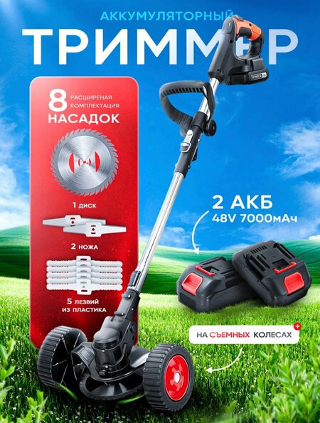 Комментарий:Аккумуляторный триммер на колесах - это просто мечта для дачника! Больше не нужно наклоняться и напрягать спину, просто катите его по траве и наслаждайтесь результатом. Два аккумулятора позволяют обработать большую площадь без подзарядки, а 8 насадок дают возможность подстричь траву любой высоты и густоты. Красный цвет выглядит ярко и стильно. Лёгкий, удобный, и очень эффективный. Настоятельно рекомендую всем, кто заботится о своем здоровье и хочет быстро и качественно привести газон в порядок!