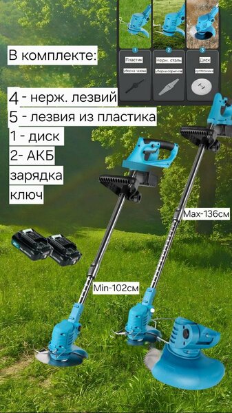 Триммер аккумуляторный садовый: Симфония легкости и мощи в уходе за вашим садом Представляем вашему вниманию аккумуляторный садовый триммер – идеальное решение для поддержания безупречного порядка на вашем участке. Забудьте о проводах, бензине и утомительном дергании стартера! Этот триммер подарит вам свободу движения и несравненное удобство в работе. В комплекте вы найдете все необходимое для мгновенного старта: Триммер: Легкий, эргономичный и мощный, он станет вашим надежным помощником в борьбе с сорняками и поддержании идеального газона. Аккумулятор (2 шт.): Двойной запас энергии для продолжительной работы без перерывов. Зарядное устройство: Быстрая и эффективная зарядка аккумуляторов. Дисковый нож: Для уверенного среза жесткой травы и кустарников. Лепестковые ножи металлические (2 шт.): Прочные и долговечные, они справятся с самой сложной растительностью. Лепестковые ножи пластиковые (5 шт.): Идеальны для деликатной обработки газонов и клумб. Ключи для сборки: Все необходимые инструменты для быстрой и простой сборки. Руководство по эксплуатации: Подробная инструкция, которая поможет вам освоить триммер в кратчайшие сроки. Этот триммер – это не просто инструмент, это инвестиция в красоту и ухоженность вашего сада!