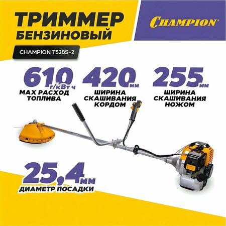 Триммер бензиновый Champion Т 528S-2 - долговечный инструмент, основным назначением которого является стрижка травяных газонов и сорняков. При необходимости с его помощью также удастся убрать мелкие подлески и кустарники. Агрегат такой модификации подходит для окашивания участков большой площади. Устройство безопасно в использовании. От летящей травы и различных мелких предметов пользователя уберегает особый кожух. Триммер такой модели отличается грамотно сбалансированной конструкцией. Установлен надежный мотор. Есть опцию, которая облегчает его запуск. Гарантией длительного срока службы изделия является воздушное охлаждение. Преимущества: Солидная мощность (2.0 л. с). Двухтактный двигатель, который отличается длительным сроком службы. U-образная рукоятка. Сравнительно малый вес (6,7 кг). Не нужно отдельно покупать ремень, нож, леску.