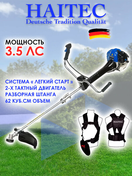 Бренд HAITEC был специально разработан немецкой компанией FUXTEC для российского рынка, что позволило поставлять продукцию компании с учетом всех требований российского законодательства и в обход западных санкций. Продукцию под брендом HAITEC можно приобрести только в России. При производстве садовой техники используются настройки узлов и агрегатов с учетом стандартов топлива и температурных условий эксплуатации. Вся информация на коробах и в инструкциях русифицирована и сертифицирована российскими органами. совершенно новый уникальный ПО дизайну - POWER SENSE с двигателем 62 куб. см Мультитул FUXTEC FX-MS162 2 в 1 бензиновый триммер легкий старт (тросс) Мощный 2-х тактный двигатель 3,5 л. с. с рабочим объемом 62 куб. см3 и воздушным охлаждением. Три антивибрационные муфты, установленные на штанге, обеспечивают отсутствие вибрации при работе. Возможность технического обслуживания воздушного фильтра и карбюратора без использования инструментов. Защитная металлическая скоба для топливного бака. Используется бензиновая смесь 1:40 (на 1л бензина АИ 92 добавить 25 мл масла для 2-х тактных двигателей). Триммерная головка COMFORT, не требующая вскрытия катушки для намотки лески, c автоматической подачей. Профессиональный комфортный ремень. Аварийный выключатель. Карбюратор с насосом подкачки. Плавная регулировка скорости. 9-зубчатый приводной вал с несколькими жесткими подшипниками. Бесконтактное зажигание (CDI). Новая конструкция цилиндра и поршня уменьшает износ и продлевает срок службы двигателя. А благодаря устройству Easy Starter, машина очень легко запускается. Больше не нужно прилагать лишние усилия и дергать или даже рвать стартовый шнур. Медленное и непрерывное вытягивание троса сжимает внутреннюю пружину, которая, резко разворачиваясь запускает двигатель. Внутренний приводной вал был полностью переработан и установлен на нескольких масляных амортизаторах в алюминиевой направляющей, что позволило добиться дополнительного снижения вибрации. Мобильность и многофункциональность в одном устройстве. Удобная эргономичная рукоятка велосипедного типа обеспечивает комфорт и безопасность при работе с устройством. Идеально подходит для быстрой и эффективной стрижки больших зеленых насаждений и жестких сорняков. Используя трехлопастной нож, можно легко подстричь кустарники и тонкие деревья.