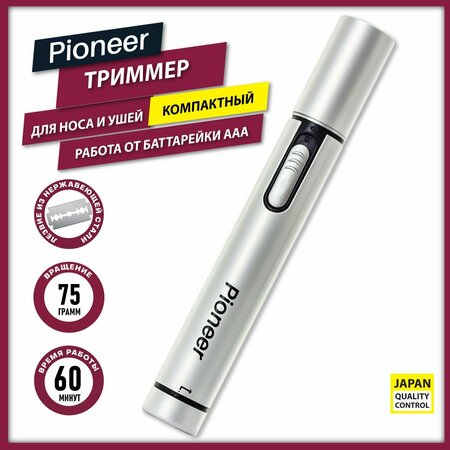 Триммер Pioneer NT02 для стрижки волос в носу и ушах поможет Вам выглядеть ухоженно всегда. Данная модель имеет эргономичный дизайн и небольшой вес (20 г), благодаря чему его удобно держать и использовать. Корпус красно-белого цвета выполнен из качественного пластика. Прибор способен работать непрерывно в течение 60 минут, а лезвия из нержавеющей стали позволят тщательно удалить все нежелательные волоски. Триммер Pioneer NT02 работает лишь от 1 батарейки типа ААА 1,5 В (не входит в комплект). Благодаря такому типу питания и своему компактному размеру, его удобно брать с собой в любые путешествия! За ним просто ухаживать – для очистки достаточно просто снять головку, очистить ее от волосков и других загрязнений с помощью щеточки, входящей в комплект и протереть корпус сухой или слегка влажной мягкой тканью. Для защиты от загрязнений прибор поставляется в защитном колпачке. Размеры: длина прибора (с колпачком) - 11 см; длина (без колпачка) - 10,6 см; диаметр - 1,2 см; длина щеточки - 4 см. Данный триммер станет прекрасным подарком близкому человеку к любому празднику!