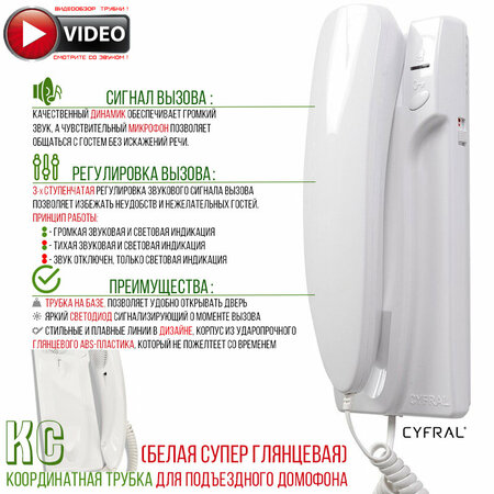 Трубка абонентская переговорная , Цифрал КС предназначена для работы в составе домофонных комплексов. Трубка может подключаться к координатно-матричным линиям связи домофонов «Цифрал», «Визит», «Элтис» и аналогичных. Функции: Звуковой и светодиодный вызов абонента. Регулировка громкости сигнала вызова. Возможность отключения трубки с сохранением световой индикации вызова. Осуществление дуплексной связи абонента с посетителем. Дистанционное открывание дверного замка. Эквивалентное сопротивление абонентской линии не более: 30 Ом. Совместима с домофонами Vizit, Метаком, Элтис, Цифрал.